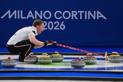 Canada's Marc Kennedy in action during the men's curling round robin session against China, at the 2026 Winter Olympics, in Cortina d'Ampezzo, Italy, Sunday, Feb. 15, 2026. (AP Photo/Misper Apawu)