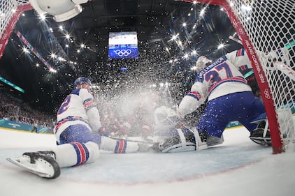 United States' Matt Boldy and United States' goalkeeper Connor Hellebuyck, right, make a save during a preliminary round match of men's ice hockey between Latvia and the United States at the 2026 Winter Olympics, in Milan, Italy, Thursday, Feb. 12, 2026. (David W Cerny/Pool Photo via AP)