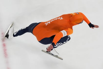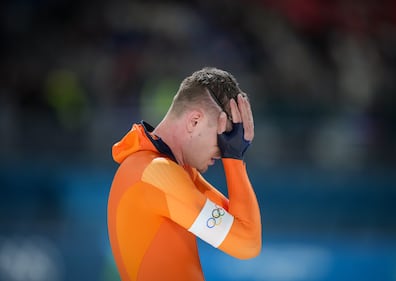 NetherlandsÕ Joep Wennemars reacts after competing in his heat during the men's 1,000 metre speedskating competition at the 2026 Winter Olympics, in Milan, on Wednesday, February 11, 2026. THE CANADIAN PRESS/Darryl Dyck