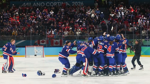 Megan Keller #5 of Team United States celebrates with teammates after scoring the game-winning goal to win the gold medals in the overtime during the Women's Gold Medal match between the United States and Canada on day 13 of the Milano Cortina 2026 Winter Olympic games at Milano Santagiulia Ice Hockey Arena on Feb. 19, 2026 in Milan, Italy. (Bruce Bennett/Getty Images)
