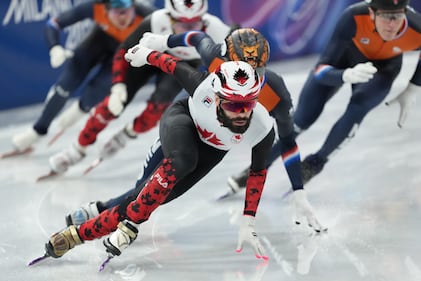 Canada's Steven Dubois competes in the men's 500m short track speed skating final event during the 2026 Milan Cortina Winter Olympics in Milan, Italy on Wednesday, Feb. 18, 2026. THE CANADIAN PRESS/Nathan Denette
