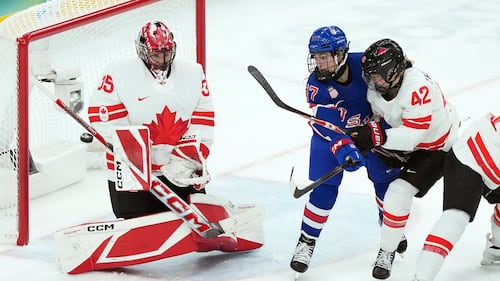 Canada goalie Ann-Renee Desbiens (35) makes the save as United States' Abbey Murphy (37) and Canada's Claire Thompson (42) battle in front during the first period of the women's gold medal hockey game at the 2026 Winter Olympics, in Milan, Thursday, Feb. 19, 2026. THE CANADIAN PRESS/Nathan Denette