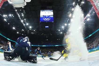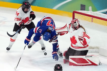Megan Keller #5 of Team United States scores the game winning goal in overtime against Claire Thompson #42 and Ann-Renee Desbiens #35 of Team Canada to win the gold medal during the Women's Gold Medal match between the United States and Canada on day 13 of the Milano Cortina 2026 Winter Olympic games at Milano Santagiulia Ice Hockey Arena on Feb. 19, 2026 in Milan, Italy. (Jared C. Tilton/Getty Images)