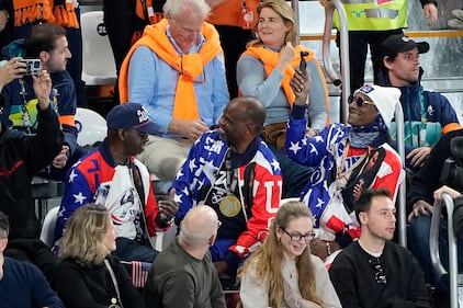 American rapper Flavor Flav, center, attends the skeleton mixed team competition at the 2026 Winter Olympics, in Cortina d'Ampezzo, Italy, Sunday, Feb. 15, 2026. (AP Photo/Akmal Rajput)