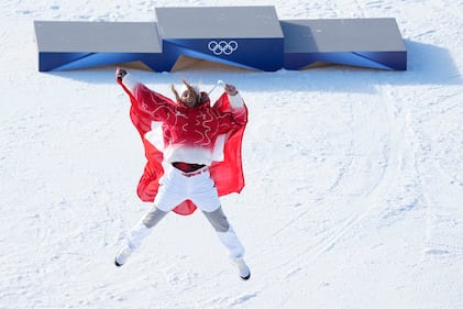 Canada's Dylan Deschamps celebrates during the men's freestyle skiing big air qualifications at the 2026 Winter Olympics, in Livigno, Italy, Sunday, Feb. 15, 2026. (AP Photo/Lindsey Wasson)