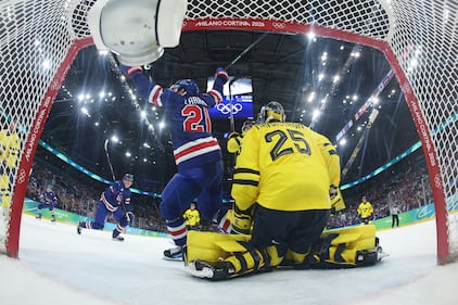 United States' Dylan Larkin (21) celebrates after scoring a goal against goalkeeper Jacob Markstrom (25) during a men's ice hockey quarterfinal game between the United States and Sweden at the 2026 Winter Olympics, in Milan, Italy, Wednesday, Feb. 18, 2026. (Bruce Bennett/Pool Photo via AP)