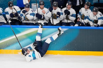 Finland's Roope Hintz, bottom, falls during a preliminary round match of men's ice hockey between Slovakia and Finland at the 2026 Winter Olympics, in Milan, Italy, Wednesday, Feb. 11, 2026. (AP Photo/Petr David Josek)