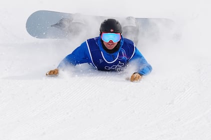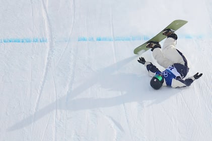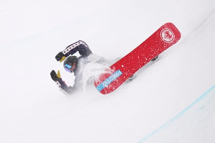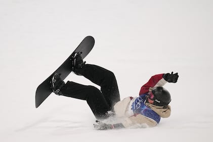 Japan's Ryoma Kimata crashes during the men's snowboarding slopestyle finals at the 2026 Winter Olympics, in Livigno, Italy, Wednesday, Feb. 18, 2026. (AP Photo/Abbie Parr)