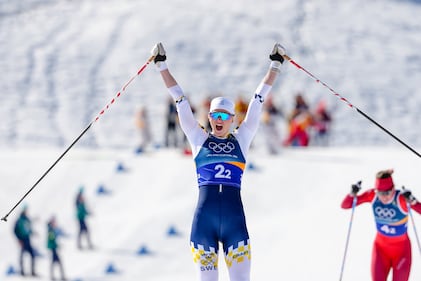 Maja Dahlqvist, of Sweden, crosses the finish line to win the gold medal, ahead of Nadine Faehndrich, of Switzerland, in the cross-country skiing women's team sprint free at the 2026 Winter Olympics, in Tesero, Italy, Wednesday, Feb. 18, 2026. (AP Photo/Kirsty Wigglesworth)