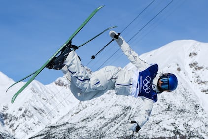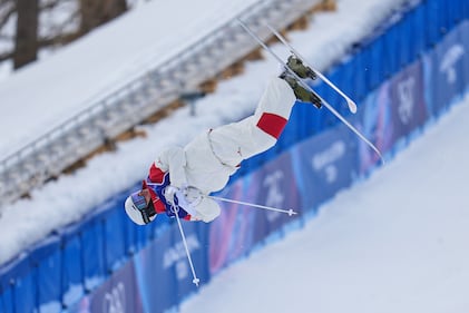 New Zealand's Lucas Ball competes during the men's freestyle skiing big air qualifications at the 2026 Winter Olympics, in Livigno, Italy, Sunday, Feb. 15, 2026. (AP Photo/Julia Demaree Nikhinson)