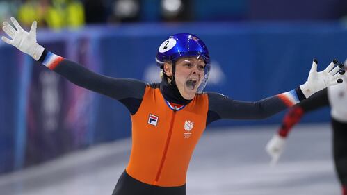 Xandra Velzeboer of the Netherlands wins gold during the short track speed skating women's 500m at the 2026 Winter Olympics, in Milan, Italy, Thursday, Feb. 12, 2026. (AP Photo/Natacha Pisarenko)