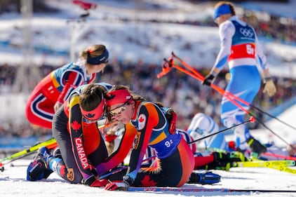 Liliane Gagnon, center, and Alison Mackie, of Canada, react after finishing the cross-country skiing women's team sprint free at the 2026 Winter Olympics, in Tesero, Italy, Wednesday, Feb. 18, 2026. (AP Photo/Kirsty Wigglesworth)