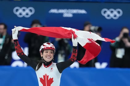 Canada's Courtney Sarault celebrates winning the silver medal in the women's 1,000 metre short track speedskating finals at the 2026 Winter Olympics, in Milan, on Monday, February 16, 2026. THE CANADIAN PRESS/Darryl Dyck