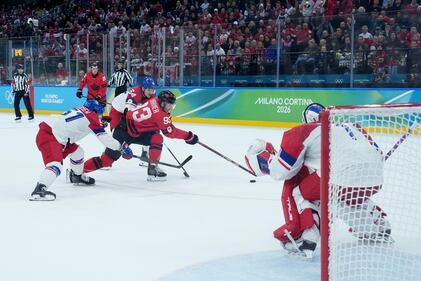 Canada's Mitch Marner (93) scores the game-winning goal against Czechia goalie Lukas Dostal (1) during overtime of a quarterfinal men's hockey game at the 2026 Winter Olympics, in Milan, on Wednesday, Feb. 18, 2026. THE CANADIAN PRESS/Darryl Dyck