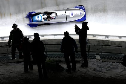Netherland's Dave Wesselink, front, and Jelen Franjic slide down the track during a two man bobsled run at the 2026 Winter Olympics, in Cortina d'Ampezzo, Italy, Monday, Feb. 16, 2026. (AP Photo/Aijaz Rahi)