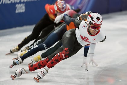 Canada's William Dandjinou leads the pack as he competes in the men's 1,000 metre short track speedskating finals at the 2026 Winter Olympics, in Milan, on Thursday, February 12, 2026. THE CANADIAN PRESS/Darryl Dyck