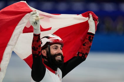 Steven Dubois of Canada wins gold during the short track speed skating men's 500m at the 2026 Winter Olympics, in Milan, Italy, Wednesday, Feb. 18, 2026. (AP Photo/Ashley Landis)