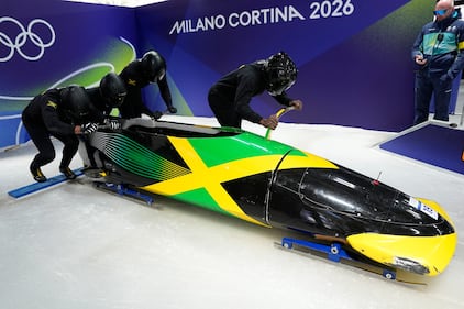 Jamaica's Shane Pitter, center, starts for a four man bobsled training session at the 2026 Winter Olympics, in Cortina d'Ampezzo, Italy, Wednesday, Feb. 18, 2026. (AP Photo/Alessandra Tarantino)