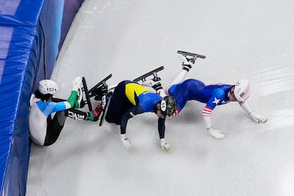 Brandon Kim of the United States, Oleh Handei of Ukraine and Daniil Eybog of Uzbekistan crash in the heats during the men's 500 meter short track speed skating at the 2026 Winter Olympics, in Milan, Italy, Monday, Feb. 16, 2026. (AP Photo/Bernat Armangue)