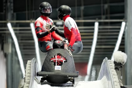 Canada's Taylor Austin, front, Keaton Bruggeling, Mike Evelyn and Shaquille Murray-Lawrence arrive at the finish during a four man bobsled run at the 2026 Winter Olympics, in Cortina d'Ampezzo, Italy, Sunday, Feb. 22, 2026. (AP Photo/Aijaz Rahi)