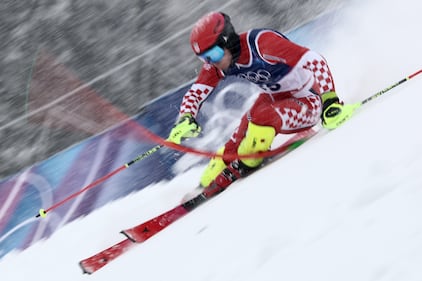 Croatia's Filip Zubcic speeds down the course, during an alpine ski, men's slalom race, at the 2026 Winter Olympics, in Bormio, Italy, Monday, Feb. 16, 2026. (AP Photo/Gabriele Facciotti)