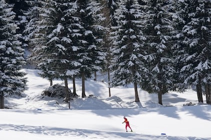 An athlete trains on the biathlon course at the 2026 Winter Olympics, in Anterselva, Italy, Wednesday, Feb. 18, 2026. (AP Photo/David J. Phillip)