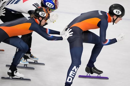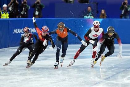 Teun Boer of the Netherlands crashes into Jens van 't Wout of the Netherlands as Steven Dubois of Canada leads during the short track speed skating men's 500m final at the 2026 Winter Olympics, in Milan, Italy, Wednesday, Feb. 18, 2026. (AP Photo/Francisco Seco)