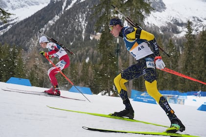 Martin Ponsiluoma, of Sweden, right, competes near Logan Pletz, of Canada, compete in the men's 20-kilometer individual biathlon race at the 2026 Winter Olympics in Anterselva, Italy, Tuesday, Feb. 10, 2026. (AP Photo/Andrew Medichini)