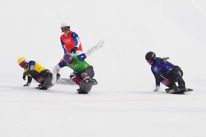 United States' Nick Baumgartner (22), France's Jonas Chollet (4), France's Loan Bozzolo (5), Italy's Lorenzo Sommariva (6) compete during the men's snowboard cross finals at the 2026 Winter Olympics, in Livigno, Italy, Thursday, Feb. 12, 2026. (AP Photo/Lindsey Wasson)