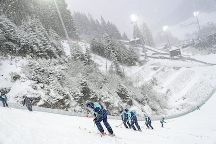 Staff work on the landing slope under falling snow before the competition round of jumps of the nordic combined team sprint at the 2026 Winter Olympics, in Predazzo, Italy, Thursday, Feb. 19, 2026. (AP Photo/Kirsty Wigglesworth)