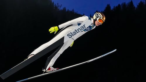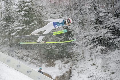 Nicole Maurer, of Canada, soars through the air past the coaches tribune during her trial jump of the ski jumping women's large hill individual at the 2026 Winter Olympics, in Predazzo, Italy, Sunday, Feb. 15, 2026. (AP Photo/Kirsty Wigglesworth)