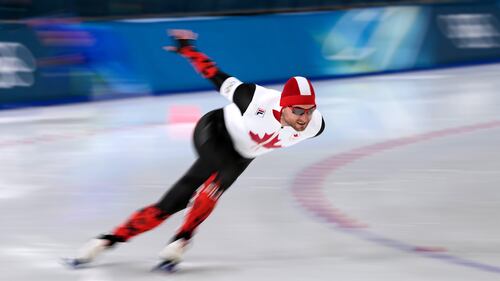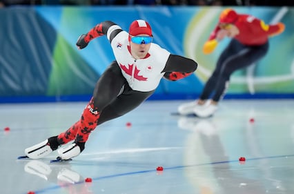 Canada's Anders Johnson competes in his heat during the men's 1,000 metre speedskating competition at the 2026 Winter Olympics, in Milan, on Wednesday, February 11, 2026. THE CANADIAN PRESS/Darryl Dyck