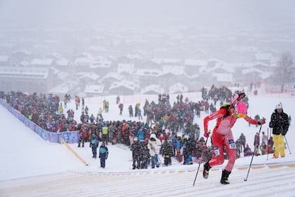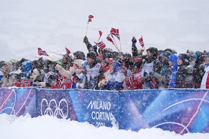 Norwegian fans cheer during a ski mountaineering women's sprint semifinal, at the 2026 Winter Olympics, in Bormio, Italy, Thursday, Feb. 19, 2026. (AP Photo/Rebecca Blackwell)