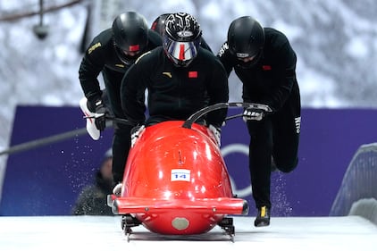 China's Kaizhi Sun, front, starts for a four man bobsled training session at the 2026 Winter Olympics, in Cortina d'Ampezzo, Italy, Thursday, Feb. 19, 2026. (AP Photo/Alessandra Tarantino)