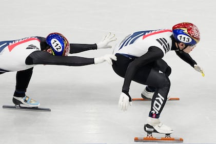 Team Korea does the hand off during the men's 5000m relay short track speed skating at the 2026 Winter Olympics, in Milan, Italy, Monday, Feb. 16, 2026. (AP Photo/Natacha Pisarenko)