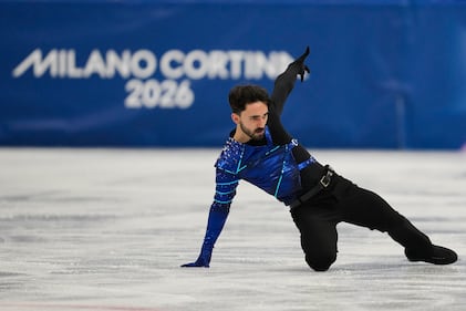 Kevin Aymoz of France competes during the men's figure skating short program at the 2026 Winter Olympics, in Milan, Italy, Tuesday, Feb. 10, 2026. (AP Photo/Ashley Landis)