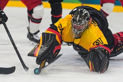 Germany's goalkeeper Philipp Grubauer (30) makes a save during a preliminary round match of men's ice hockey between Germany and Denmark at the 2026 Winter Olympics, in Milan, Italy, Thursday, Feb. 12, 2026. (AP Photo/Hassan Ammar)