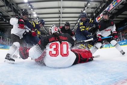 Japan's Rei Halloran tmakes a save during a preliminary round match of women's ice hockey between Japan and Sweden at the 2026 Winter Olympics, in Milan, Italy, Tuesday, Feb. 10, 2026. (Tao Xiyi/Pool Photo via AP)