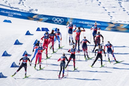 Athletes start in the cross-country skiing women's team sprint free at the 2026 Winter Olympics, in Tesero, Italy, Wednesday, Feb. 18, 2026. (AP Photo/Matthias Schrader)