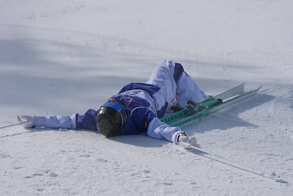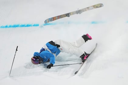 Finland's Elias Lajunen crashes during the men's freestyle skiing big air qualifications at the 2026 Winter Olympics, in Livigno, Italy, Sunday, Feb. 15, 2026. (AP Photo/Lindsey Wasson)