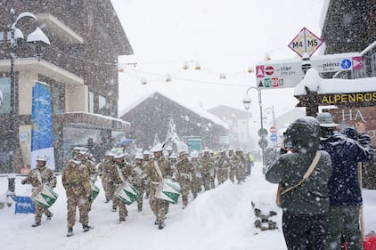 The Fanfara Alpina Sezione Valtellinese band performs in heavy snow after weather delays at the 2026 Winter Olympics, in Livigno, Italy, Thursday, Feb. 19, 2026. (AP Photo/Andy Bao)