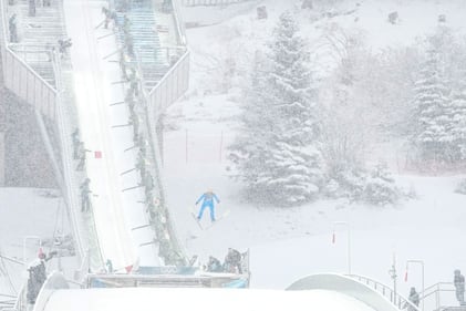 Soldiers blow snow from the ramp while Ilkka Herola, of Finland, soars through the air during his competition round jump of the nordic combined team sprint at the 2026 Winter Olympics, in Predazzo, Italy, Thursday, Feb. 19, 2026. (AP Photo/Matthias Schrader)