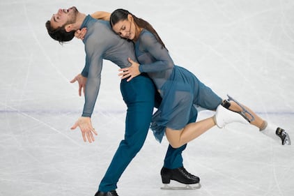 Laurence Fournier Beaudry and Guillaume Cizeron of France compete during the ice dancing free skate in figure skating at the 2026 Winter Olympics, in Milan, Italy, Wednesday, Feb. 11, 2026. (AP Photo/Natacha Pisarenko)