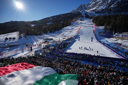 A giant Italian flag is displayed by fans during the medal ceremony where Italy's Federica Brignone won the gold medal in an alpine ski, women's giant slalom race, at the 2026 Winter Olympics, in Cortina d'Ampezzo, Italy, Sunday, Feb. 15, 2026. (AP Photo/Andy Wong)