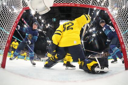 Finland's Anton Lundell, left, scores his sides second goal past Sweden's goalkeeper Filip Gustavsson during a preliminary round match of men's ice hockey between Finland and Sweden at the 2026 Winter Olympics, in Milan, Italy, Friday, Feb. 13, 2026. (Mike Segar/Pool Photo via AP)