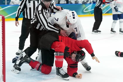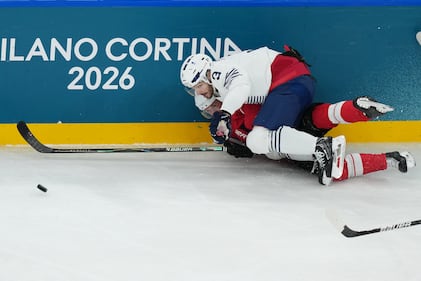 France's Charles Bertrand, up, checks Switzerland's Timo Meier during a preliminary round match of men's ice hockey between Switzerland and France at the 2026 Winter Olympics, in Milan, Italy, Thursday, Feb. 12, 2026. (AP Photo/Carolyn Kaster)