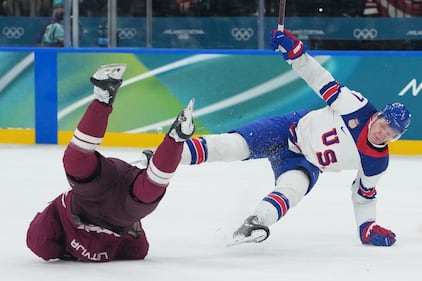 United States' Brady Tkachuk, right, collides with Latvia's Janis Jaks during a preliminary round match of men's ice hockey between Latvia and the United States at the 2026 Winter Olympics, in Milan, Italy, Thursday, Feb. 12, 2026. (AP Photo/Carolyn Kaster)
