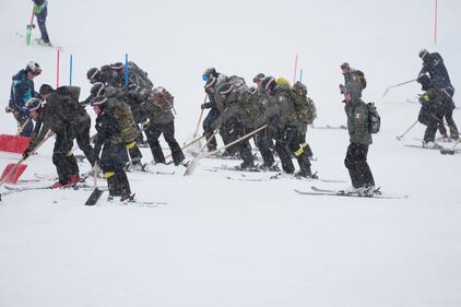 Italian Army personnel clear the course during a snowfall ahead of an alpine ski, men's slalom race, at the 2026 Winter Olympics, in Bormio, Italy, Monday, Feb. 16, 2026. (AP Photo/John Locher)