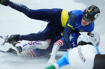 United States' Brandon Kim, 23, and Ukraine's Oleh Handei, 51, crash during a men's 500 metre short track speedskating heat at the 2026 Winter Olympics, in Milan, on Monday, February 16, 2026. THE CANADIAN PRESS/Darryl Dyck