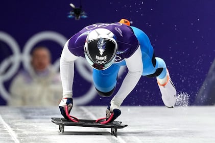 France's Lucas Defayet starts for a men's skeleton run at the 2026 Winter Olympics, in Cortina d'Ampezzo, Italy, Thursday, Feb. 12, 2026. (AP Photo/Aijaz Rahi)
